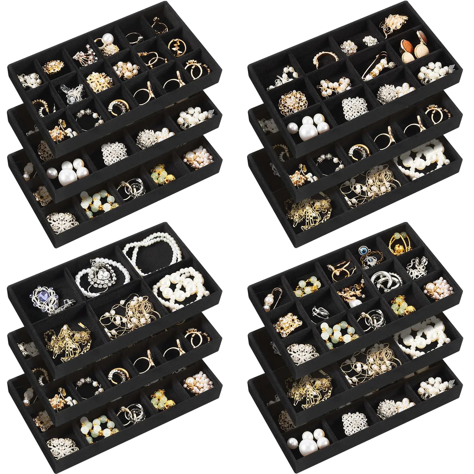 Junkin 12 Pcs Jewelry Tray Velvet Stackable Jewelry Organizer Trays Divided Earring Organizer Jewelry Storage Containers Box (Black)
